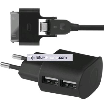 Mini chargeur secteur noir 2A connectique Apple micro USB, vous évitera la panne de batterie, câble de charge et synchonisation, base secteur avec double port USB pour charger en simulané 2 appareils, Courant 2A Tension d'entrée 12 Vdc Sortie 5 Vdc
