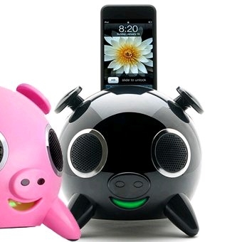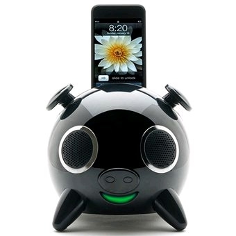 Station musicale (25W) pour iPhone et iPod, contrôle du volume en manipulant les oreilles du petit cochon, 5 hauts parleurs dont 1 caisson basse. Très fun et tendance, trouvera facilement sa place sur votre bureau! (non compatible iPhone 5 sans l'adaptateur connecteur). |