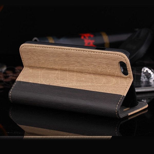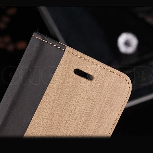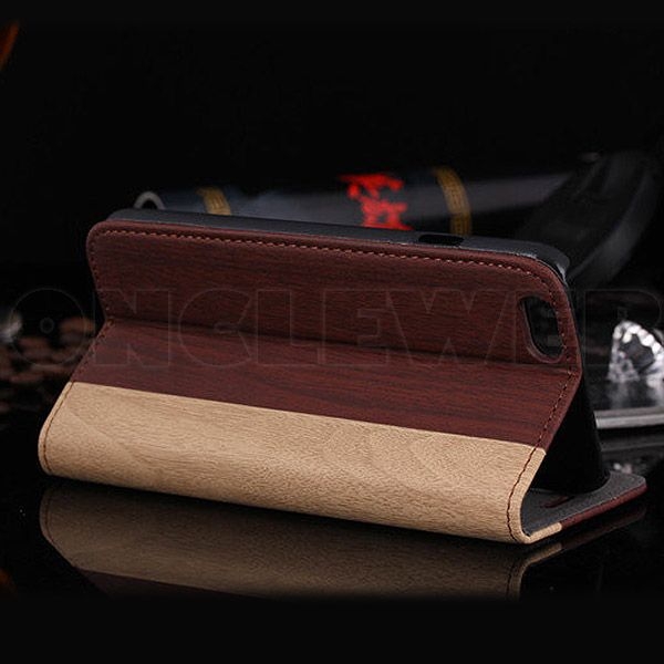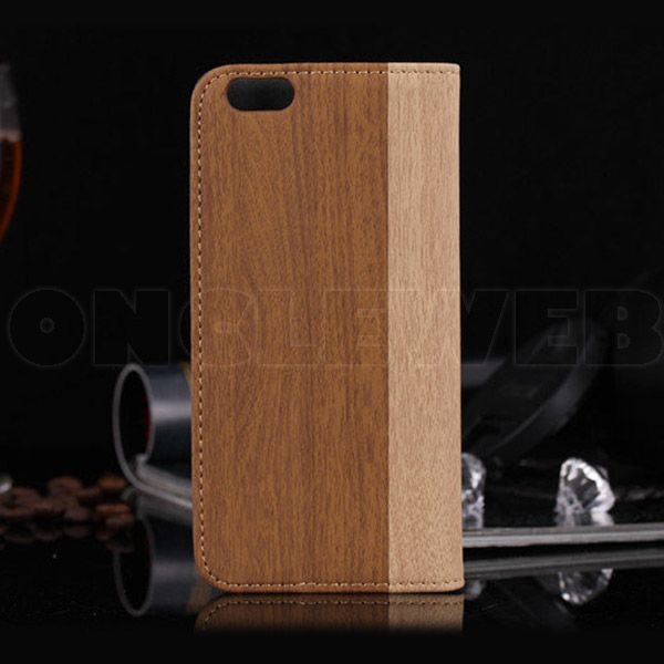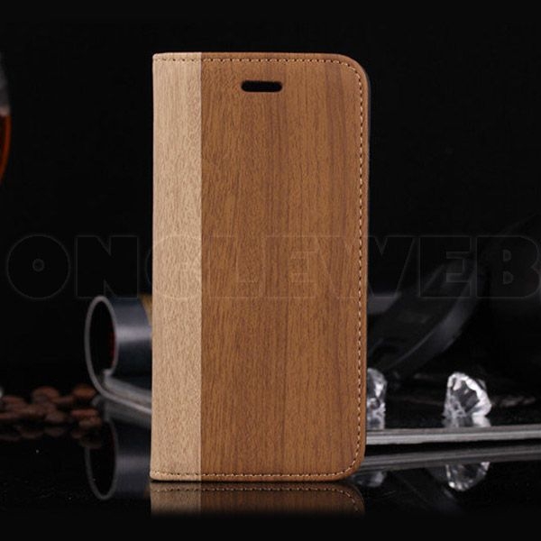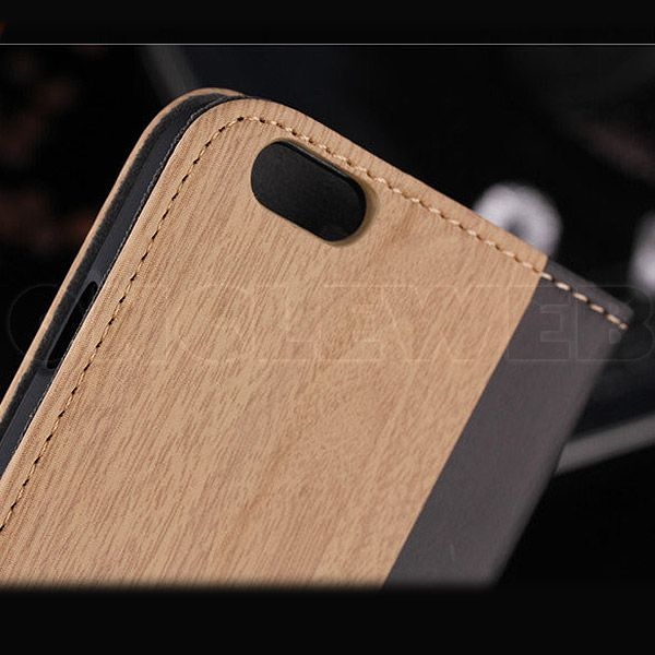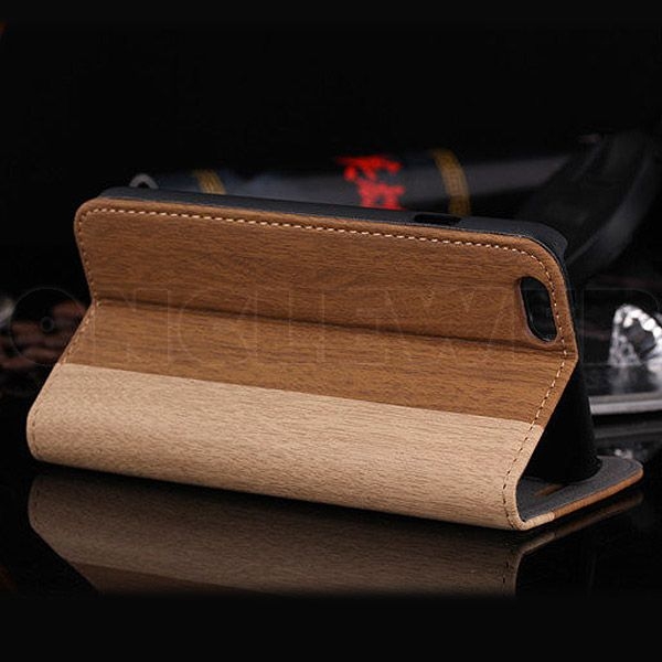 Superbe étui iPhone 6 bois en simili cuir avec ouverture portefeuille et fonction chevalet.