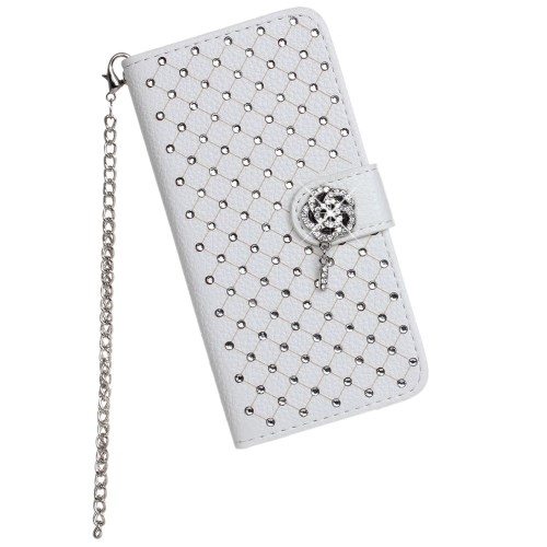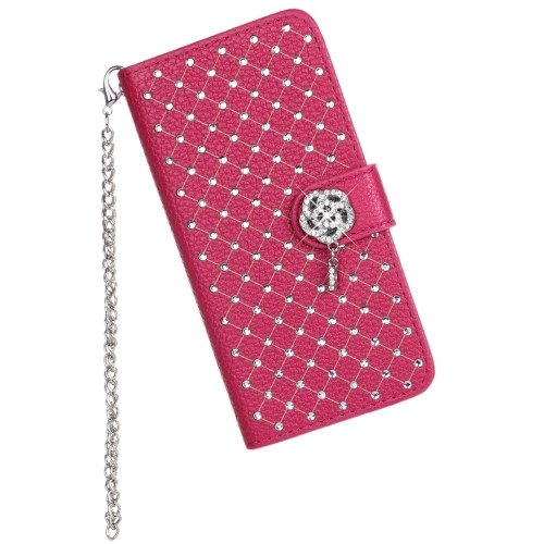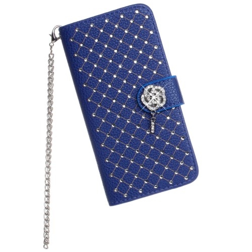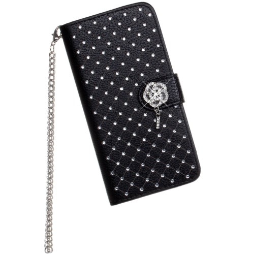 Etui strass iPhone 6 6s simili cuir grainé portefeuille. Composé de porte cartes et de la fonction chevalet, cet étui grainé strass se ferme grasse à sa languette aimantée certie de strass.