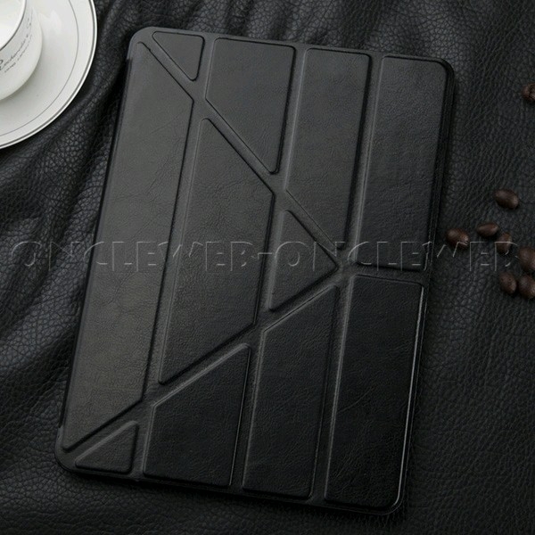 Superbe housse iPad Air stand noir de style origami, composée d’une coque en plastique résistante qui dispose de toutes les découpes nécessaires pour l’utilisation de votre tablette.