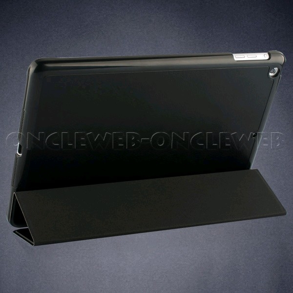 Superbe housse iPad Air type smart cover noir au design fin et minimaliste qui reprend le style du smart Cover pour vous offrir une protection discrète, efficace et élégante.