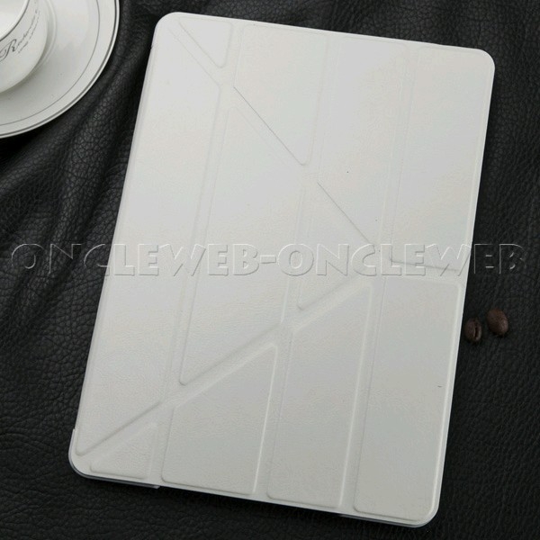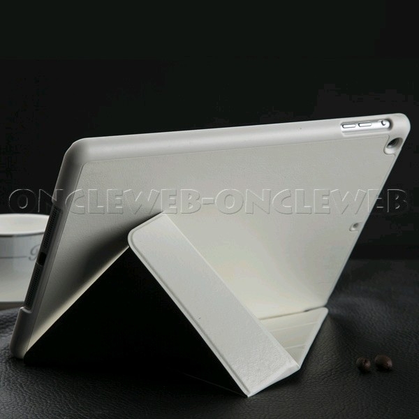Superbe housse iPad mini stand blanc de style origami, composée d’une coque en plastique résistante qui dispose de toutes les découpes nécessaires pour l’utilisation de votre tablette.