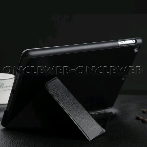 Superbe housse iPad mini stand noir de style origami, composée d’une coque en plastique résistante qui dispose de toutes les découpes nécessaires pour l’utilisation de votre tablette.