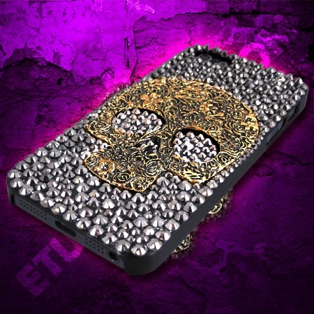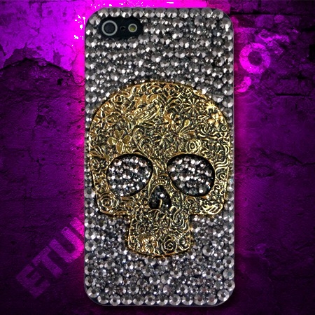 Coque iphone 5 tête de mort de couleur or avec des strass argentés, tout en relief. De quoi être monstrueusement prêt pour Halloween |