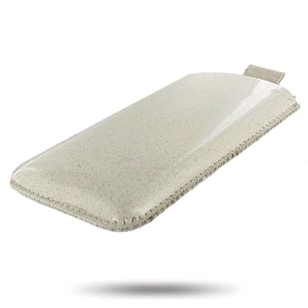 Etui fourreau iPhone 4 4S PVC crème avec des paillettes et système pull out. Très beau produit élégant à petit prix.