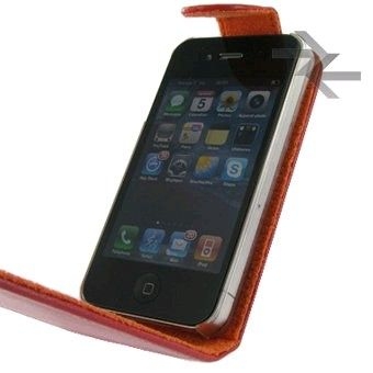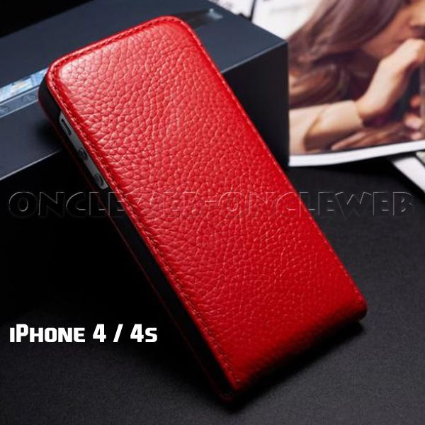 Un étui cuir véritable rouge grainé flip iPhone 4/4S de très bonne qualité à prix discount. Fermeture languette magnétique. Système de clipsage sur coque PVC transparente particulièrement pratique et élégante. Ouverture du rabat vers le bas. Un best à petit prix.