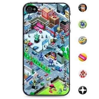 Skin autocollante repositionnable molletonné ambiance city iPhone 4/4S , superbe produit, très belle fabrication, une protection efficace et un look super fun pour votre iPhone. Inclus film de protection et 6 petits boutons en relief avec des designs différents. Idéal avec un bumper, superbe effet |