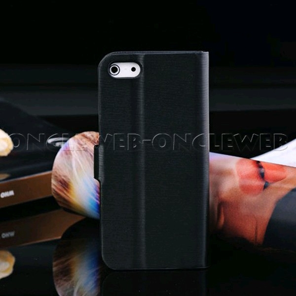 Très bel étui iPhone 5 / 5S portefeuille chevalet noir brossé constitué d'une coque PVC black mat avec son système chevalet pour incliner votre mobile. Très bonne tenue en main avec un touché effet brossé très agréable.