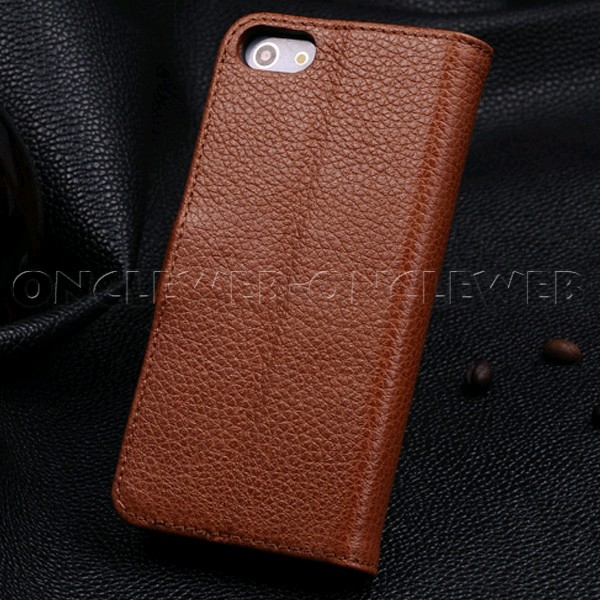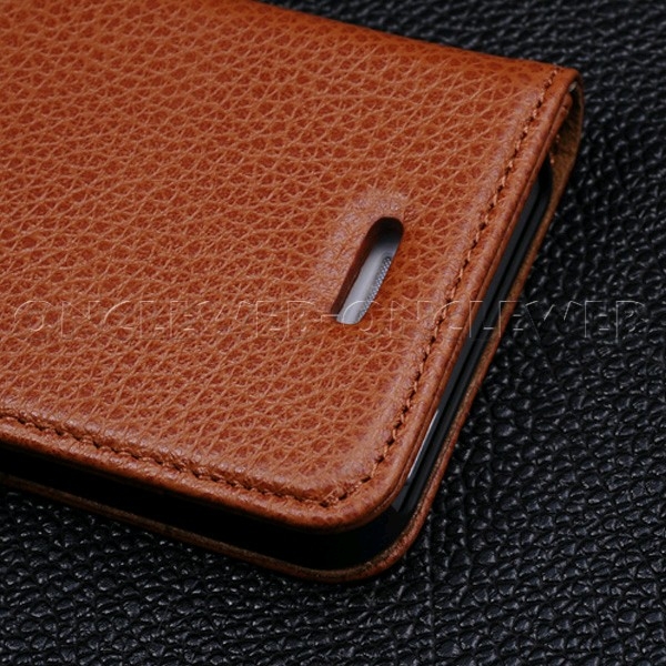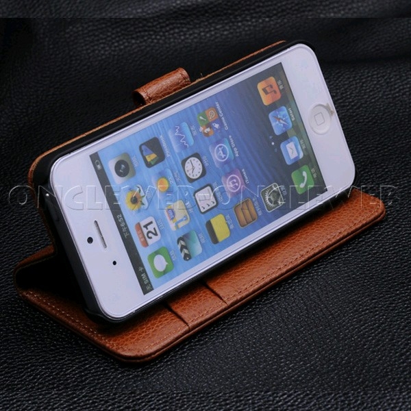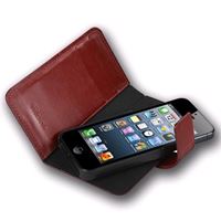 Magnifique étui iPhone 5 / 5s cuir véritable grainé luxe marron avec système chevalet en cuir véritable de très haute qualité.