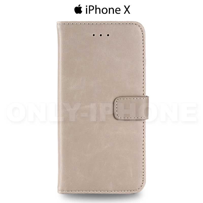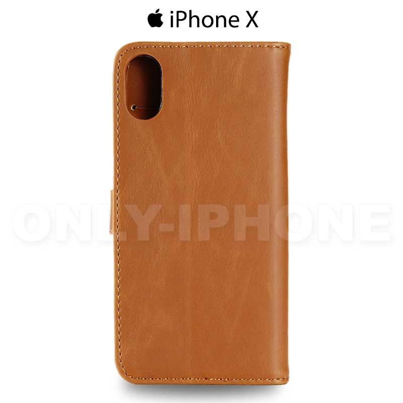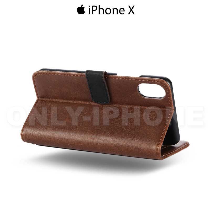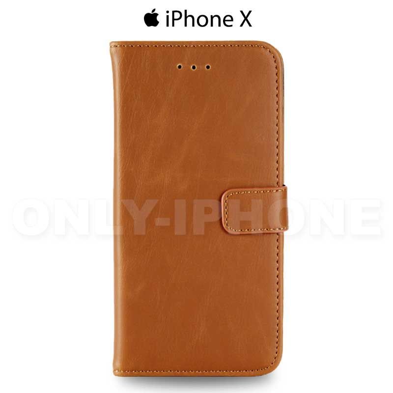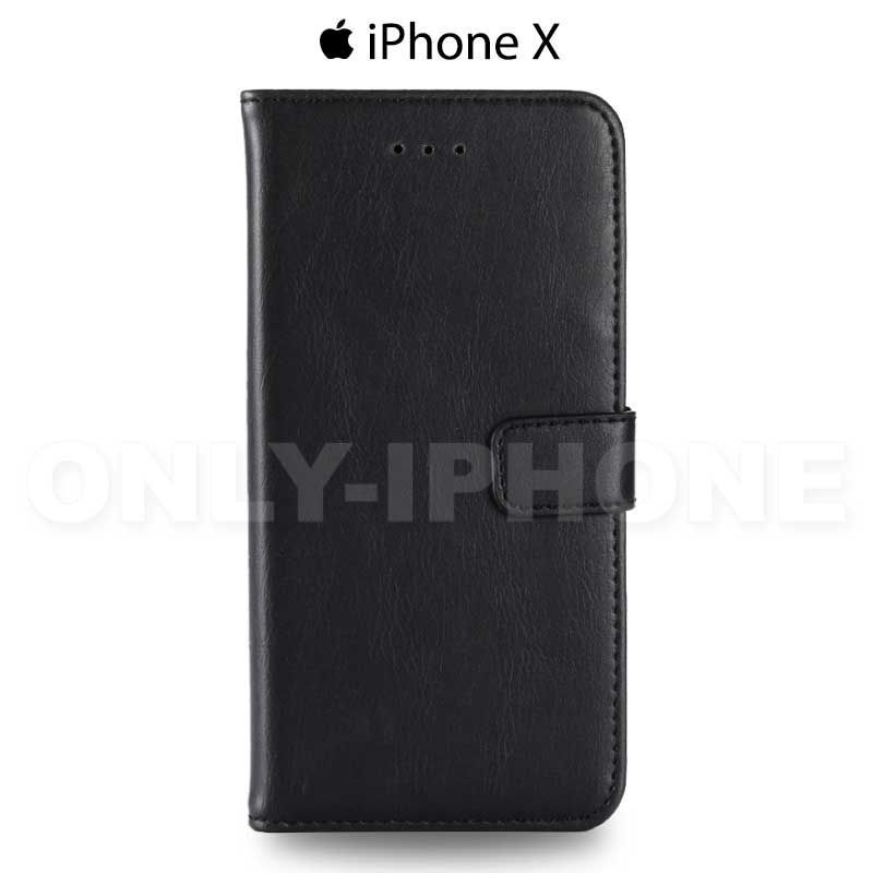 L'étui portefeuille en cuir pour iPhone X est composé d'une coque en PVC et d'un revêtement cuir avec toutes les découpes nécessaires pour la bonne utilisation de votre iPhone X.