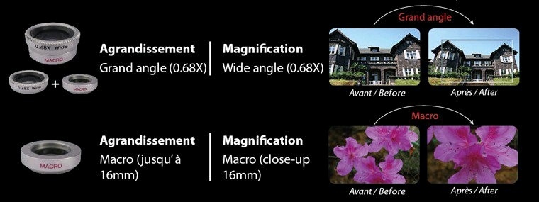 Fantastique accessoire pour les amoureux de photos à adapter sur votre iPhone 5. 2 objectifs grand angle et macro: Grand angle va permettre d'avoir plus d'éléments que une même photo: 0,68 X Macro16 mm vous permettra de saisir des détails ultra précis imperceptibles à l'oeil nu. Qualité Pro, génial |
